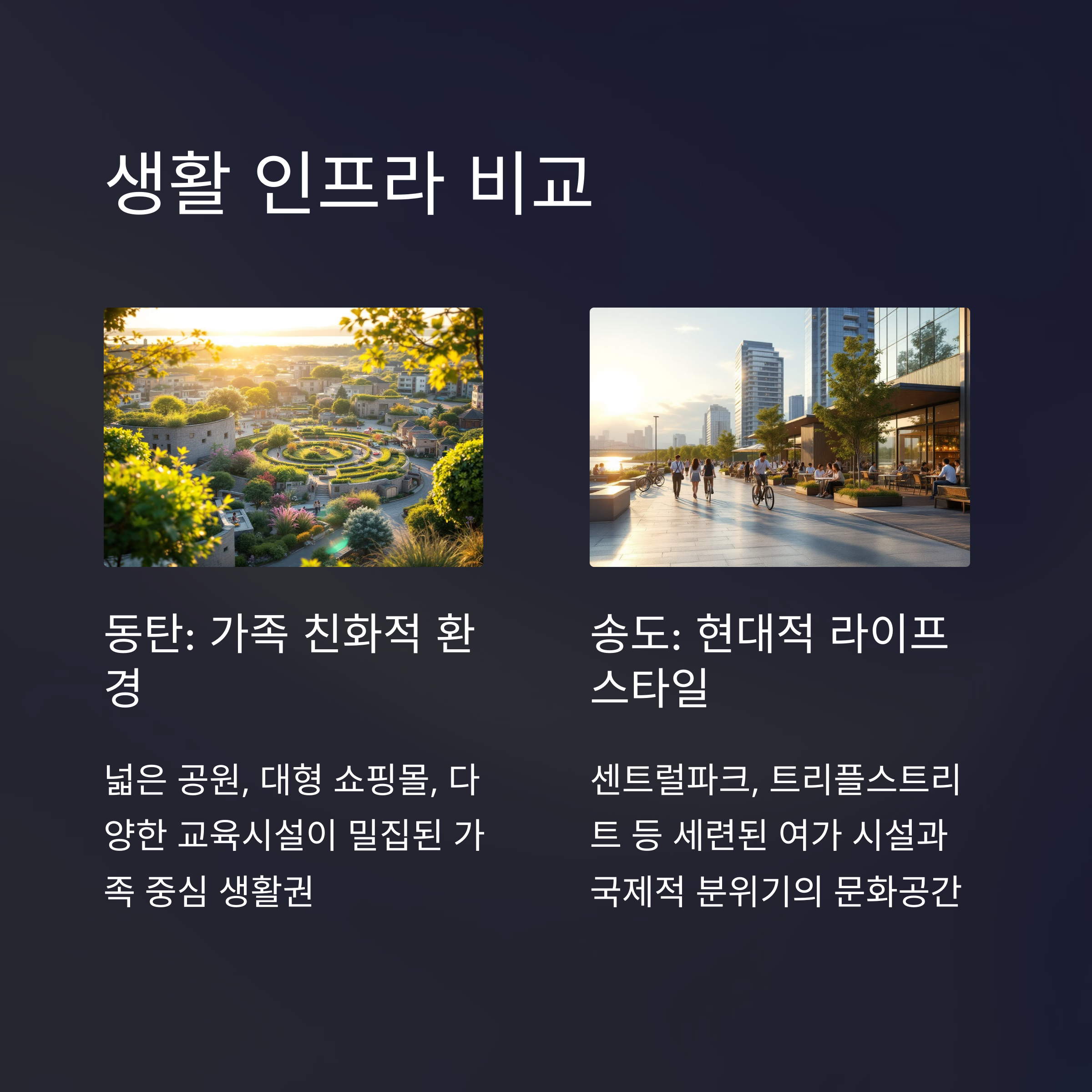 동탄은 쾌적한 주거 환경을 제공하며, 송도교육 기회에서 우위를 점하고 있습니다.