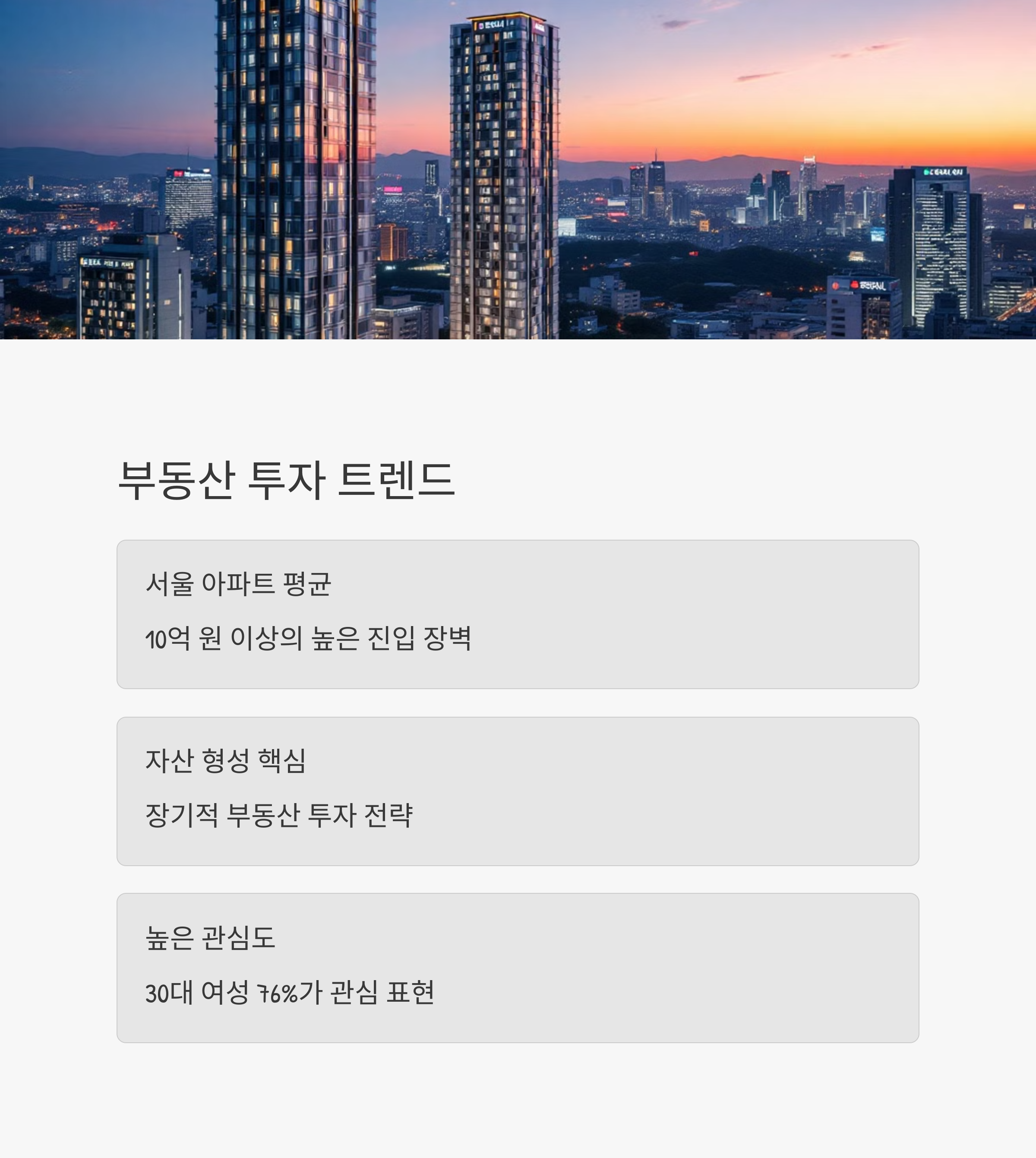 | 서울 주요 지역 아파트 평균 가격 | 10억 원 이상 |