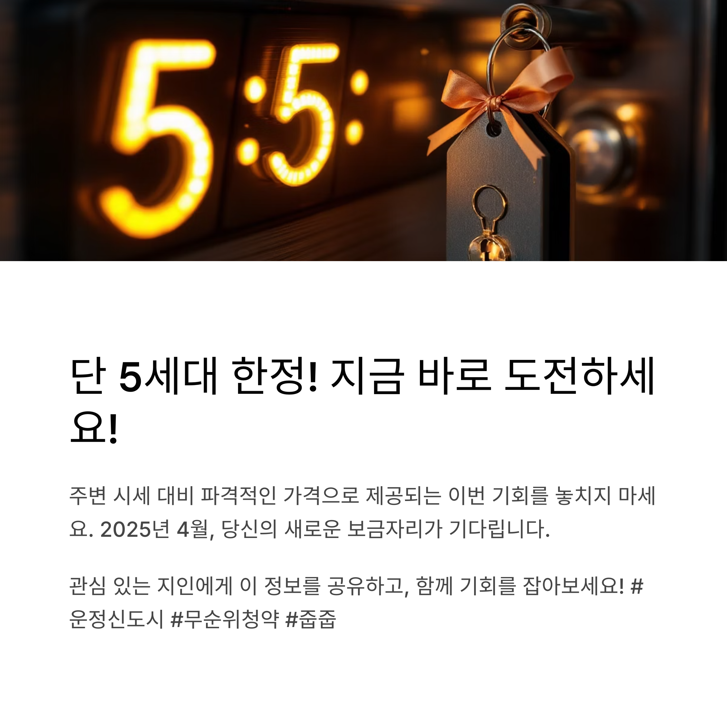 이번 공급은 총 5세대 한정으로, 청약통장 없이 신청 가능하며, 다자녀·생애최초 특별공급 세대도 포함되어 있어 실거주자와 투자자 모두에게 주목받고 있습니다.