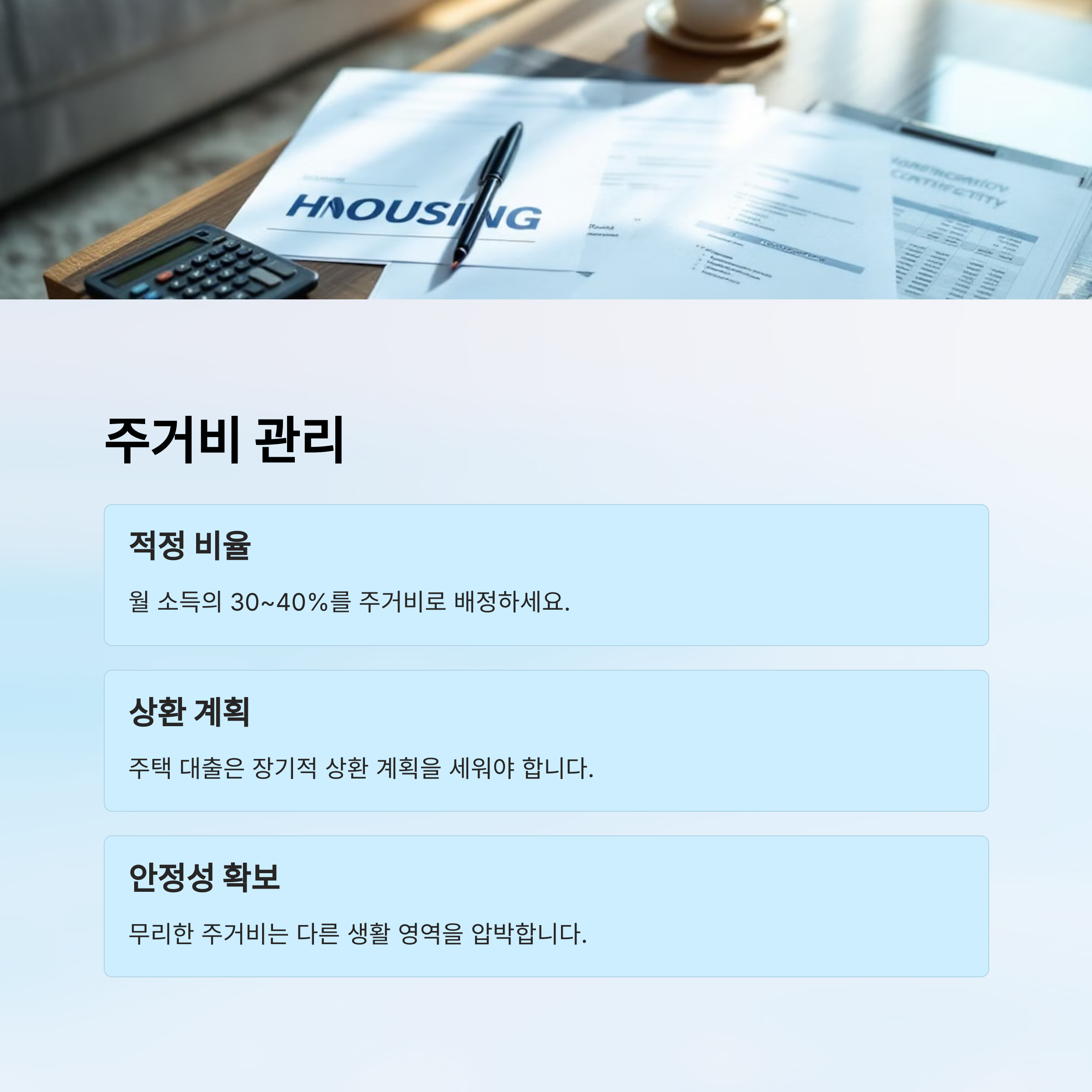 주거비 지출은 월 소득의 30~40%를 넘지 않는 것이 가장 이상적이라 합니다.