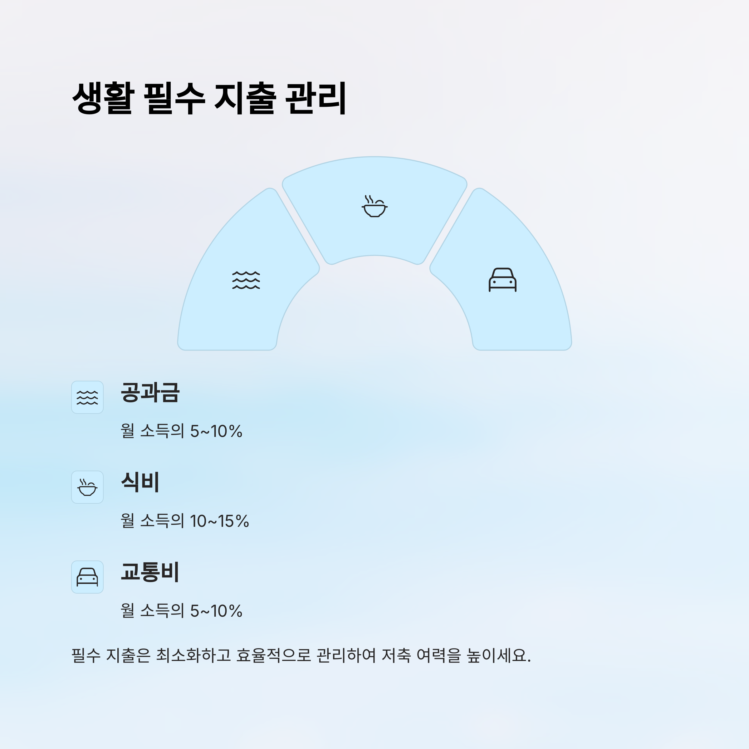 공과금, 식비, 교통비 등은 모두 월 소득 대비 5~15% 범위 내에서 조정하는 것이 좋습니다.