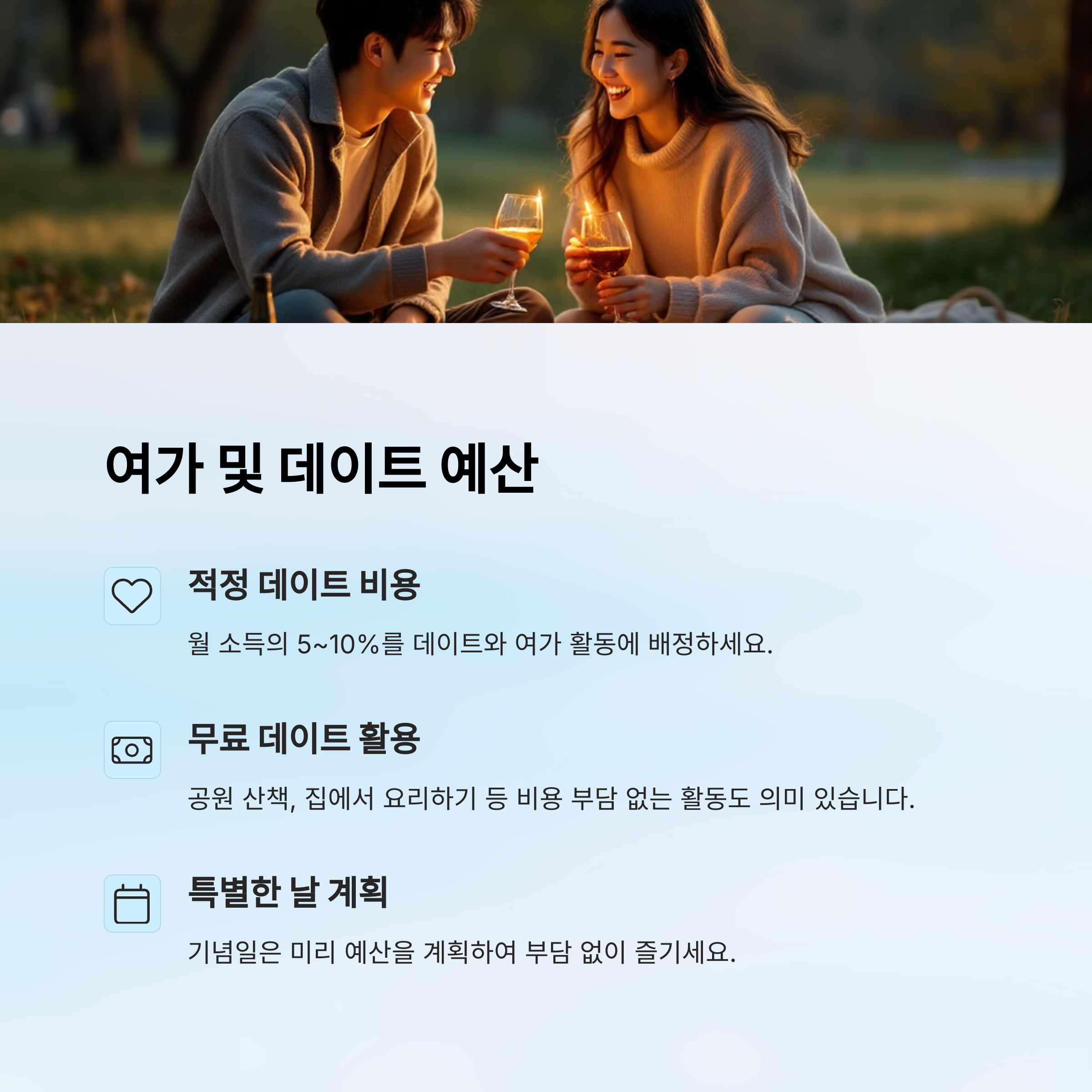 집들이나 데이트 비용 또한 월 예산 내에서 관리해야 장기적인 재정 안정성을 높일 수 있습니다.